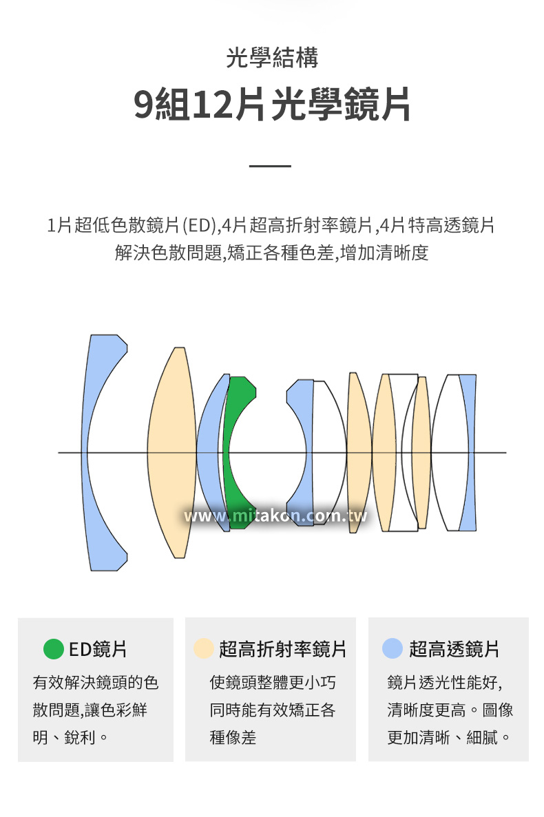 手動對焦設計和無段設計的無聲光圈環可使控光能平穩處理,尤其適合錄影。金屬外殼鏡頭,提供鏡頭更好的保護